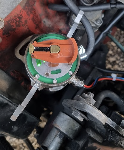 A noter qu'à cette position, le doigt de l'allumeur est en face d'une marque sur le chassis de l'allumeur (position suggérée pour le démontage ?)